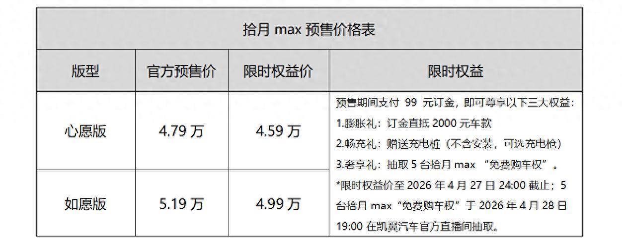 1.膨胀礼:订金直抵2000元车款2.畅充礼:赠送充电桩(不含安装,可选充电枪)3.奢享礼:抽取5台拾月max “免费购车权”。*限时权益价至2026年4月27日 24:00截止;5台拾月max“免费购车权”于2026年4月28日19:00在凯翼汽车官方直播间抽取。